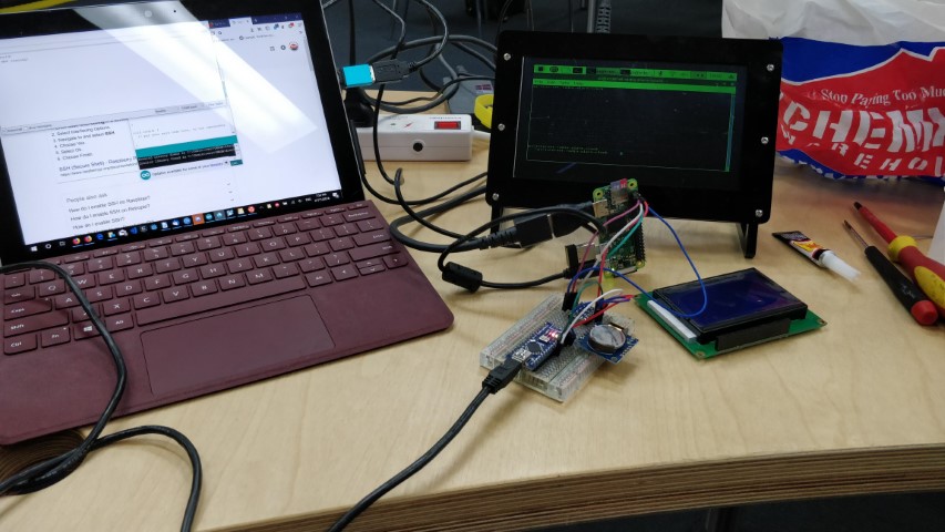 Reading the RTC (Real Time Clock) from Arduino. Later moved RTC to Raspberry Pi so it could get the time from the RTC directly. Using RTC with Raspberry Pi